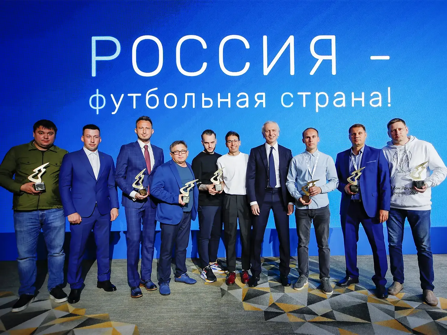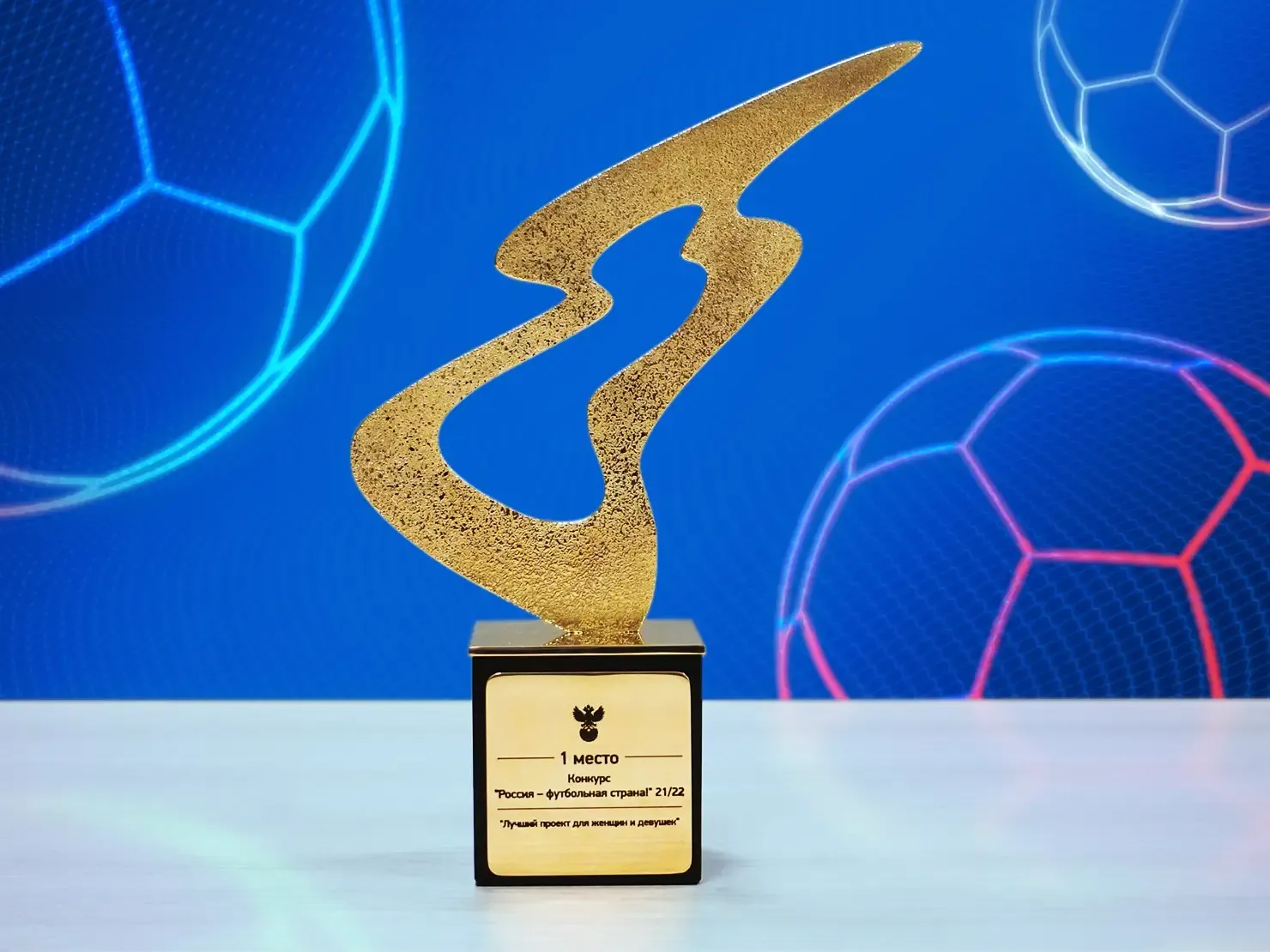 В финале конференции президент РФС Александр Дюков наградил победителей и призеров всероссийского смотра-конкурса «Россия — футбольная страна!». Мы разработали кубок, который представляет собой пламенное крыло, символизирующее страсть и волю к победе.