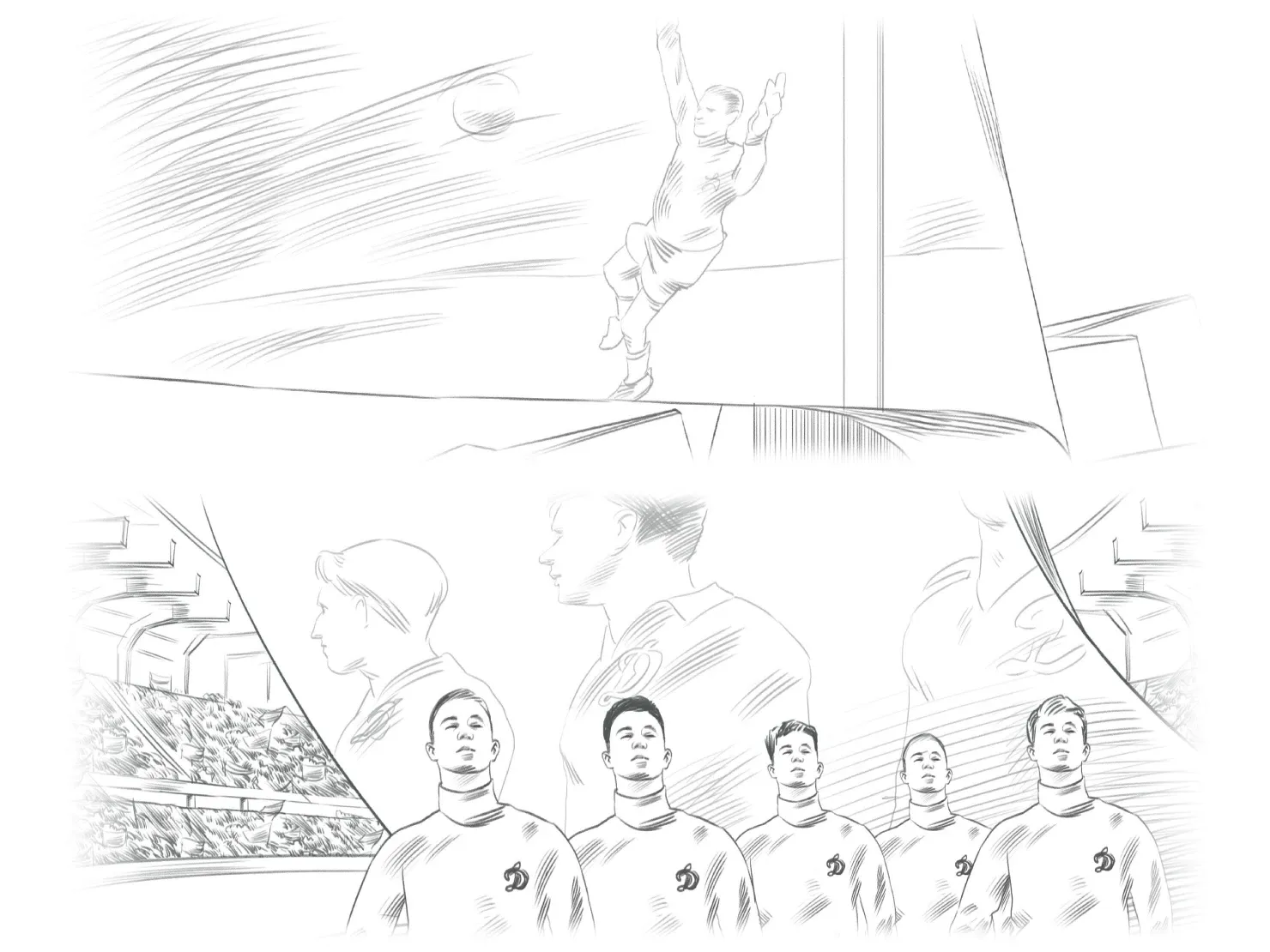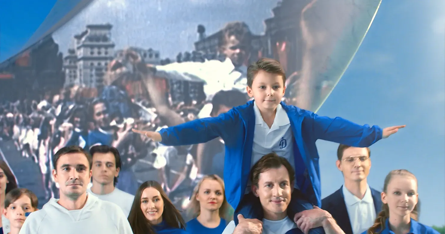 Мы вспомнили парады на красной площади, где тысячи спортсменов несли флаги, цветы и детей на плечах. И мы сделали перекличку времен, повторили это символьное шествие с современными болельщиками и нынешними героями-селебрити. Мы повторили черно-белые кадры с гордыми игроками перед матчем, вспомнили игру Яшина в воротах «Динамо». Мы добавили ту самую синюю рамку с флагов двадцатых годов на современные флаги и в виде обрамления футбольного поля. Мы исполнили самый мощный символ «Динамо» — букву «Д» в объеме, представили ее как огромный, пафосный мраморный объект и пустили его связующей нитью через весь ролик.