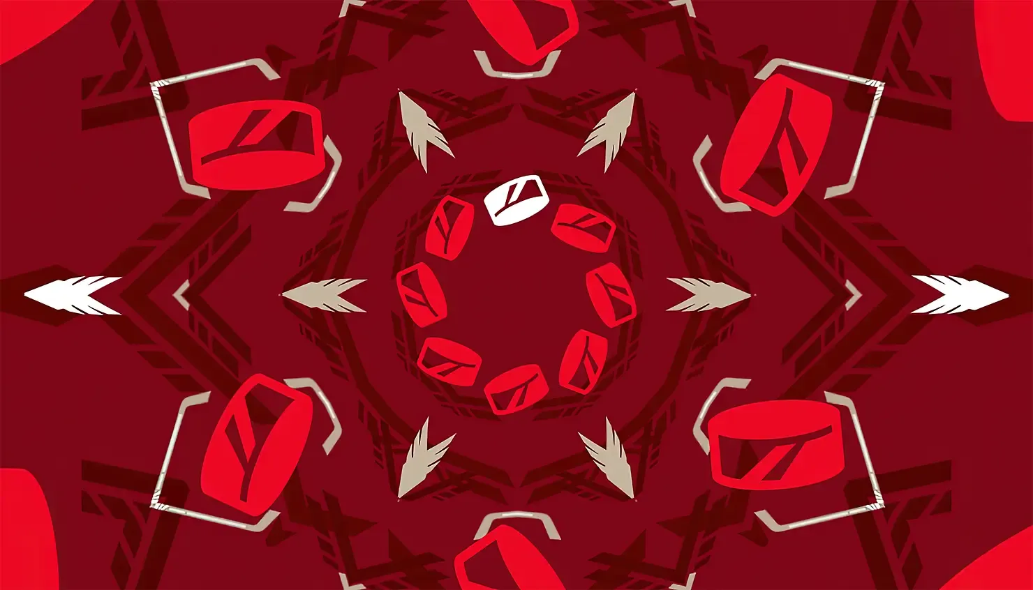 Продолжая стилистику сезона, мы разработали матчевую графику сезона, которая строится на визуальном принципе калейдоскопа. Такой прием позволяет создавать множество неповторимых узоров, которые складываются из хоккейных атрибутов и символов клуба: стрелок, перьев, клюшек, шайб и элементов логотипа.