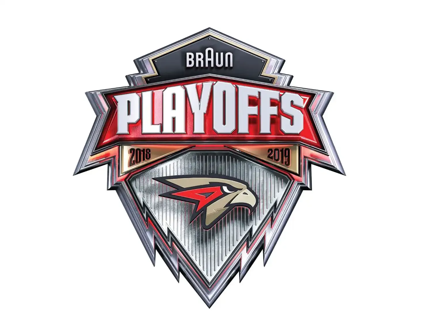 Для того, чтобы надпись «плей-офф» не потерялась, к знаку добавилось обрамление-лезвие, а логотип компании «Braun», предложившей болельщикам бритвы и триммеры для креативных стрижек, завершил композицию.
