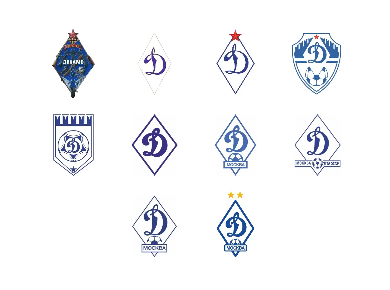 На протяжении XX века в логотип неоднократно вносились изменения: менялось начертание литеры, появлялись новые элементы. Так, в 2013-м эмблему украсили две золотые звезды в честь 10 из 11 завоеванных динамовцами чемпионских титулов.