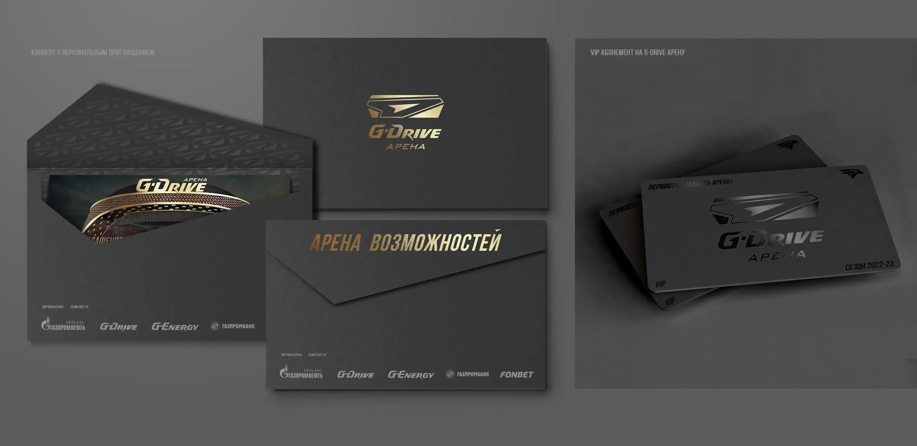 VIP-боксы отличаются от стандартных. Они выполнены в фирменном графитовом цвете с золотым тиснением, а внутри представляют собой арену в миниатюре — с чашей и трибунами. Проработка деталей поражает и восхищает. В пак входит шарф первооткрывателя, а также графитовый конверт, отделанный золотым тиснением снаружи и украшенный фирменным паттерном внутри. В конверте — карта-абонемент и пригласительный на первый матч-открытие.