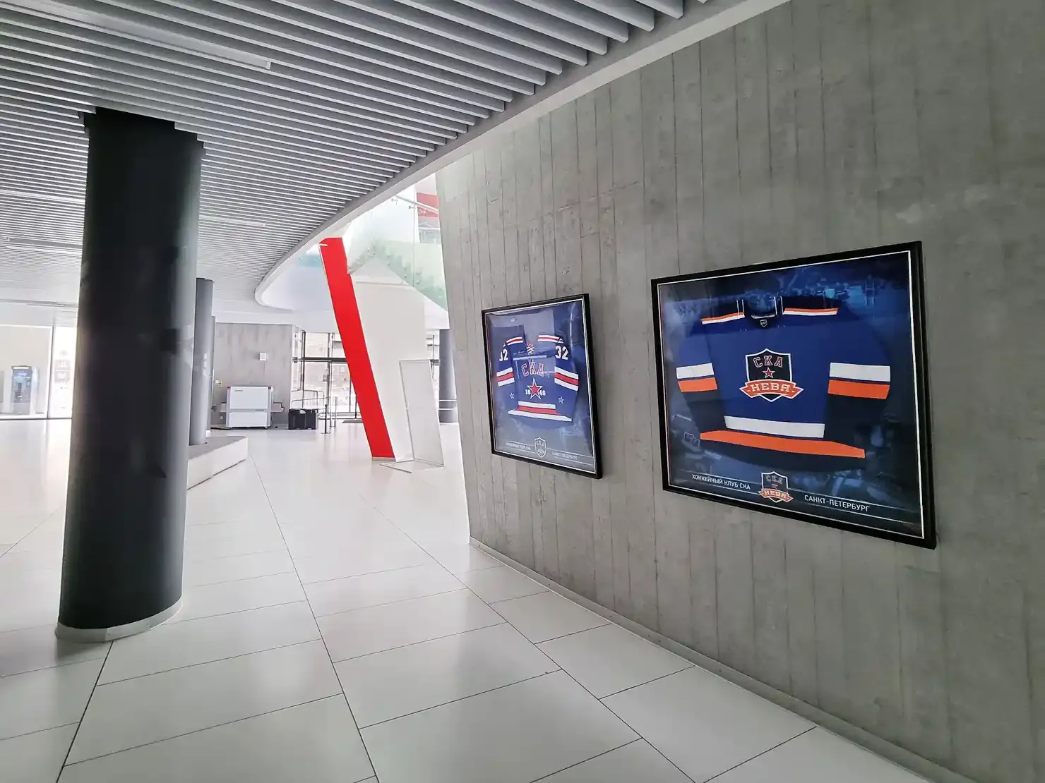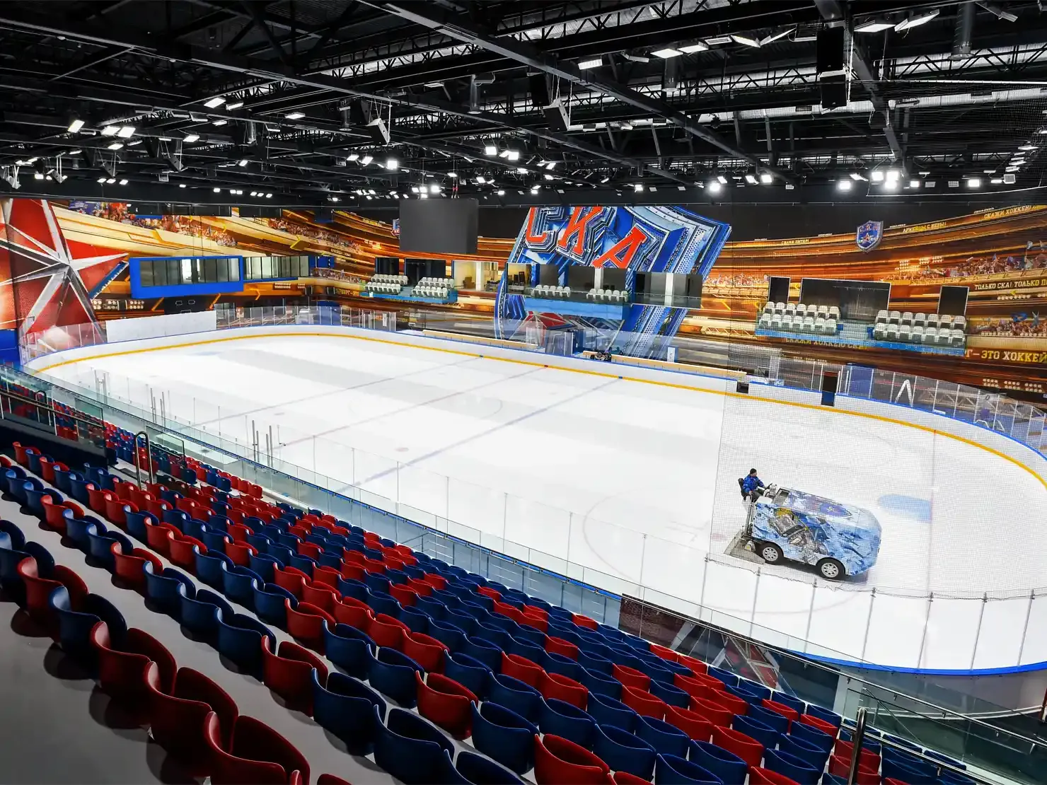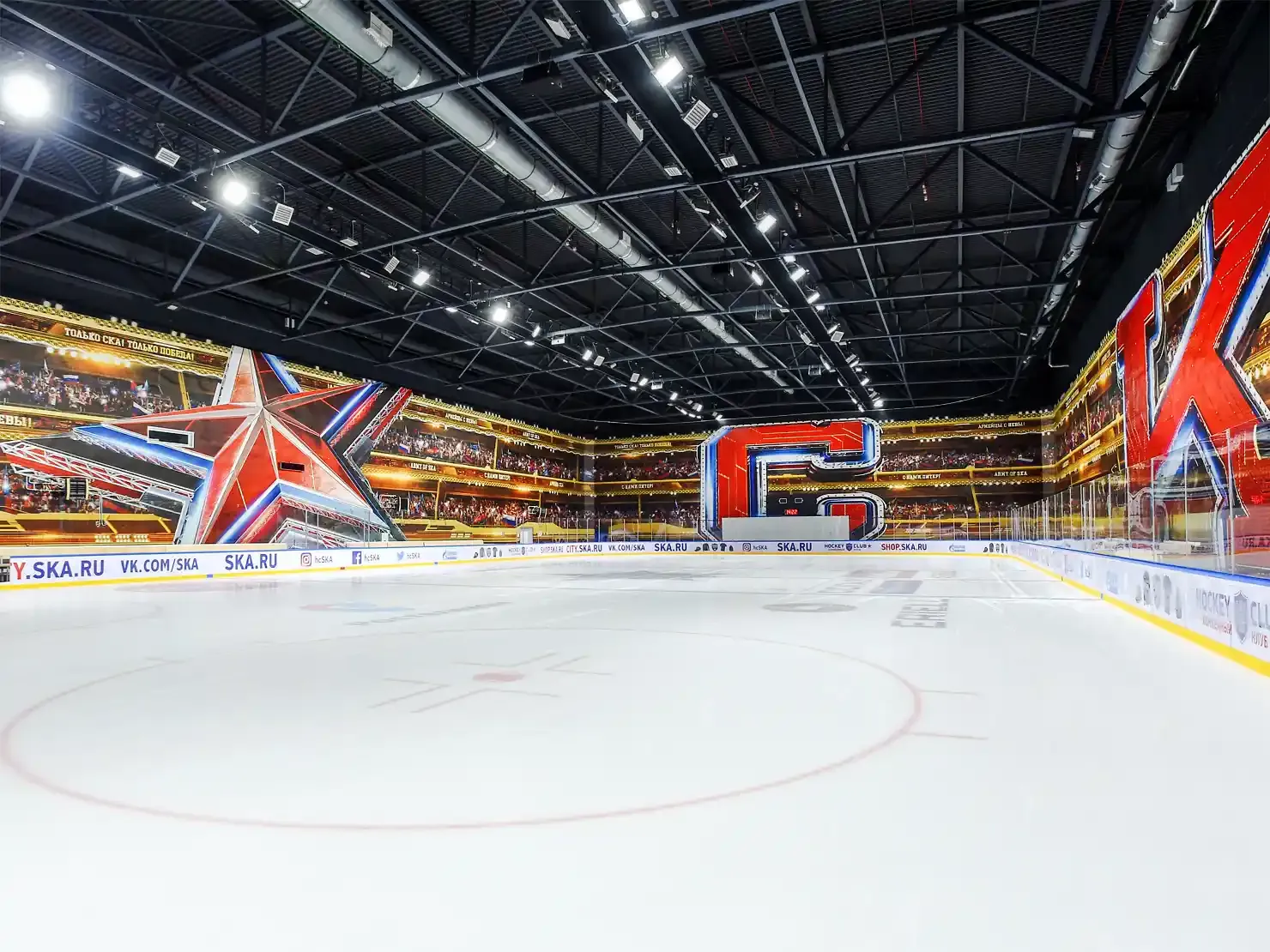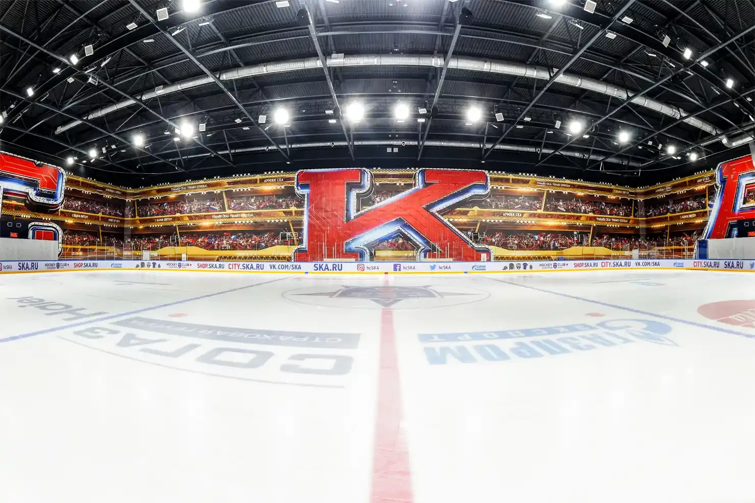 На главной арене, где проходят большие матчи, стена напротив трибун была совершенно пустой. Нам хотелось сделать пространство объемнее и живее. Так, было создано изображение футуристических золотых трибун, заполненных ликующими фанатами. В центре расположился многослойный щит СКА, выполненный в лучших традициях хоккейного бродкаста.