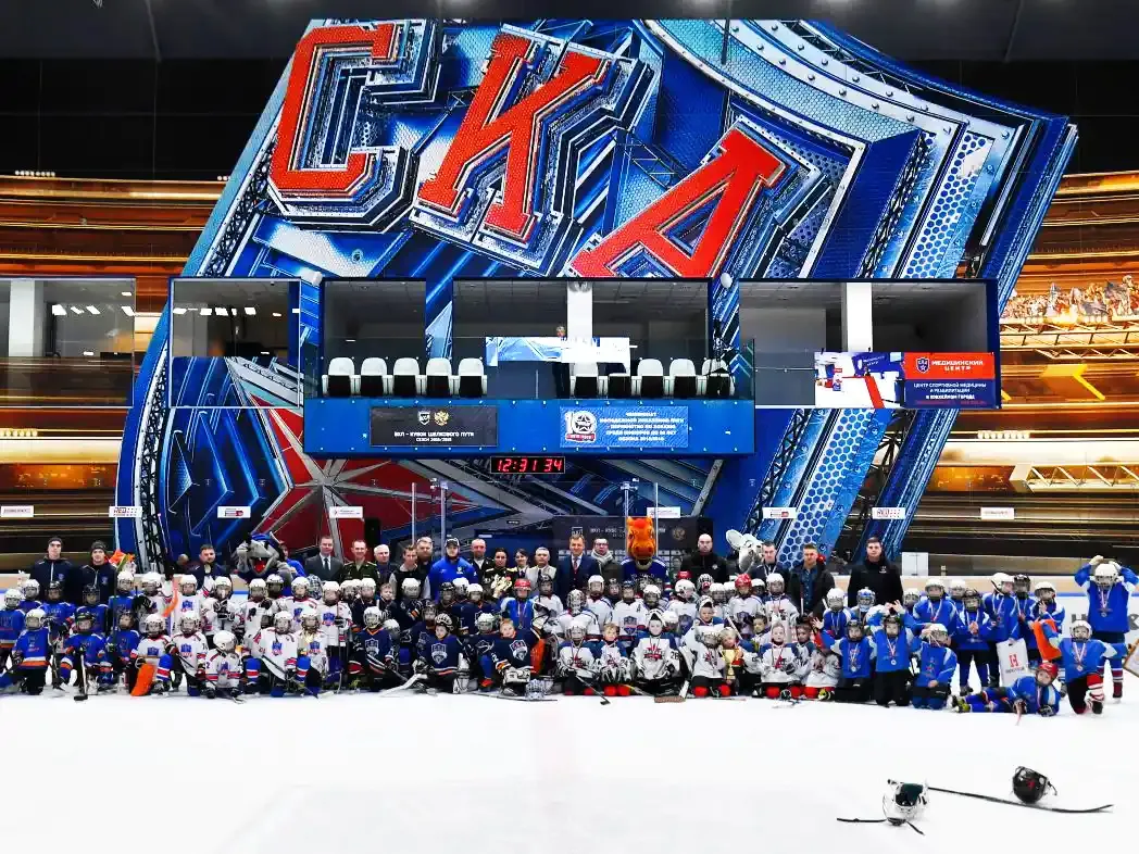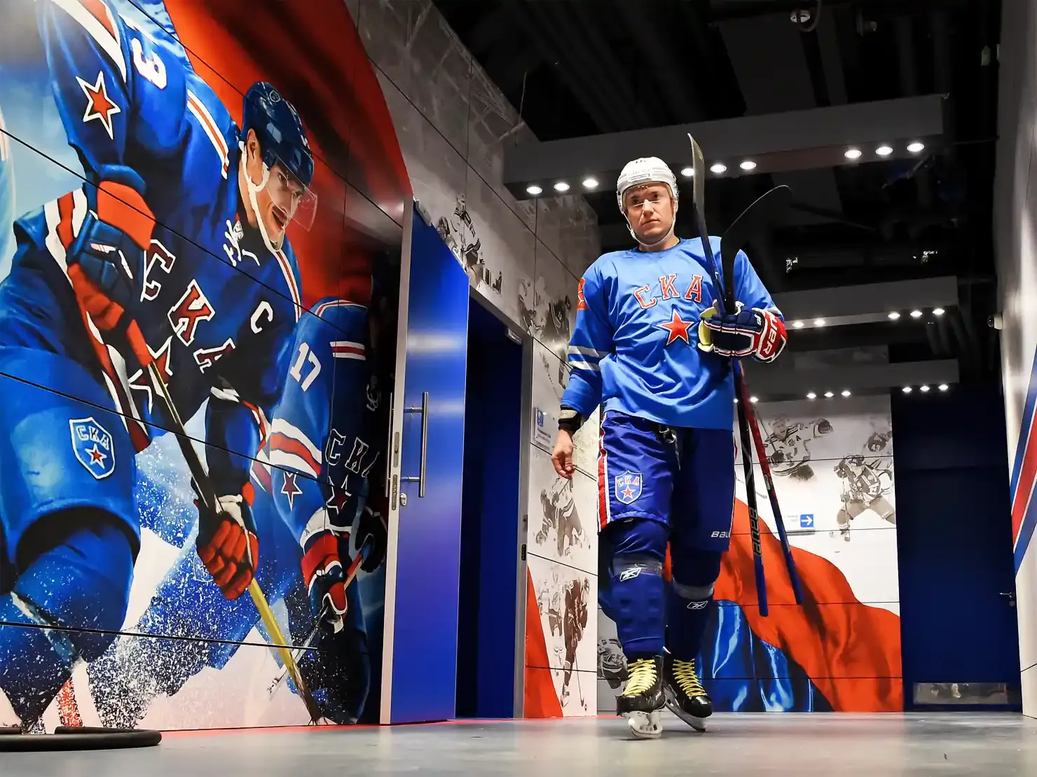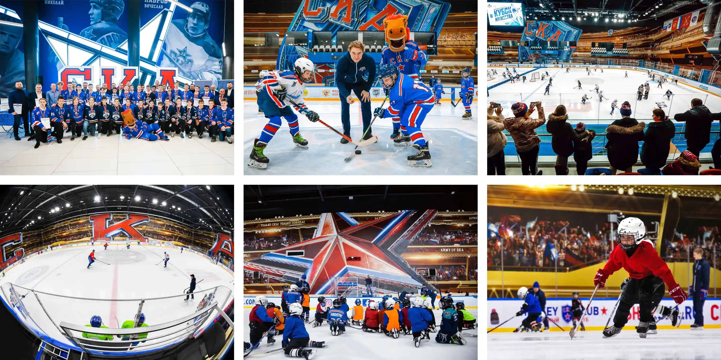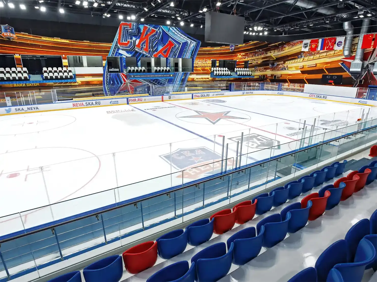 На главной арене, где проходят большие матчи, стена напротив трибун была совершенно пустой. Нам хотелось сделать пространство объемнее и живее. Так, было создано изображение футуристических золотых трибун, заполненных ликующими фанатами. В центре расположился многослойный щит СКА, выполненный в лучших традициях хоккейного бродкаста.