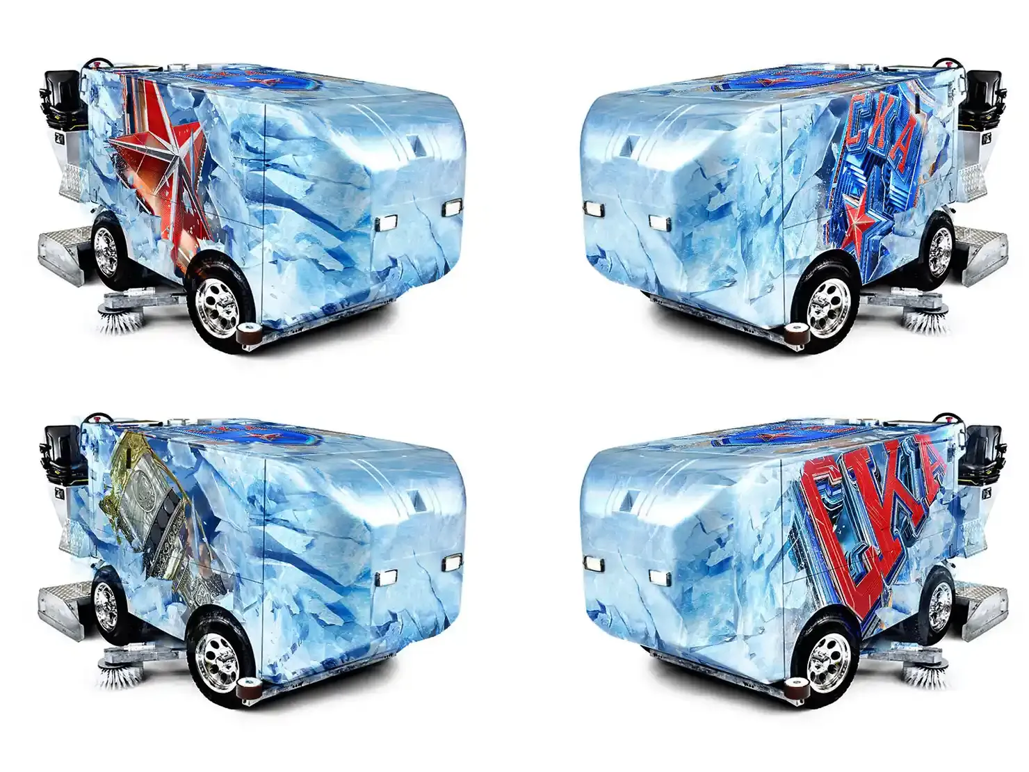Заливочные машины, будто сделаны изо льда, который пробивают символы СКА и Кубок Гагарина, выигранный дважды — в 2015 и 2017 годах.