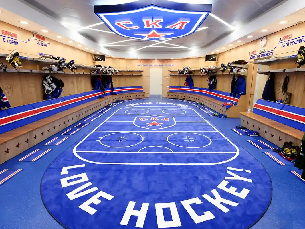 Раздевалка — сакральное место, от которого зависит настрой команды на игру. Своей геометрией оно повторяет хоккейную арену. Короб с освещением идет по всему периметру под потолком, а в центре, словно путеводная звезда, сияет эмблема армейцев. Скамейки выполнены из дерева и украшены гравировкой. У каждого хоккеиста — свой индивидуальный коврик, а в центре находится большой ковер, стилизованный под арену.