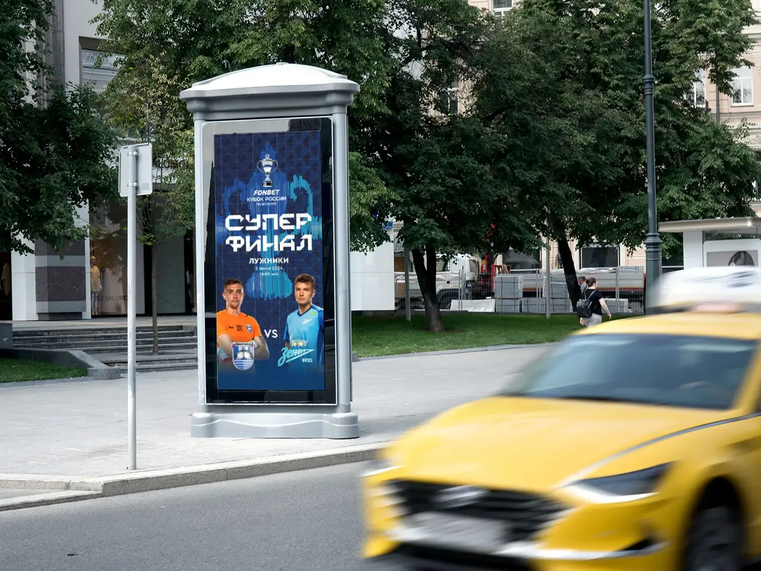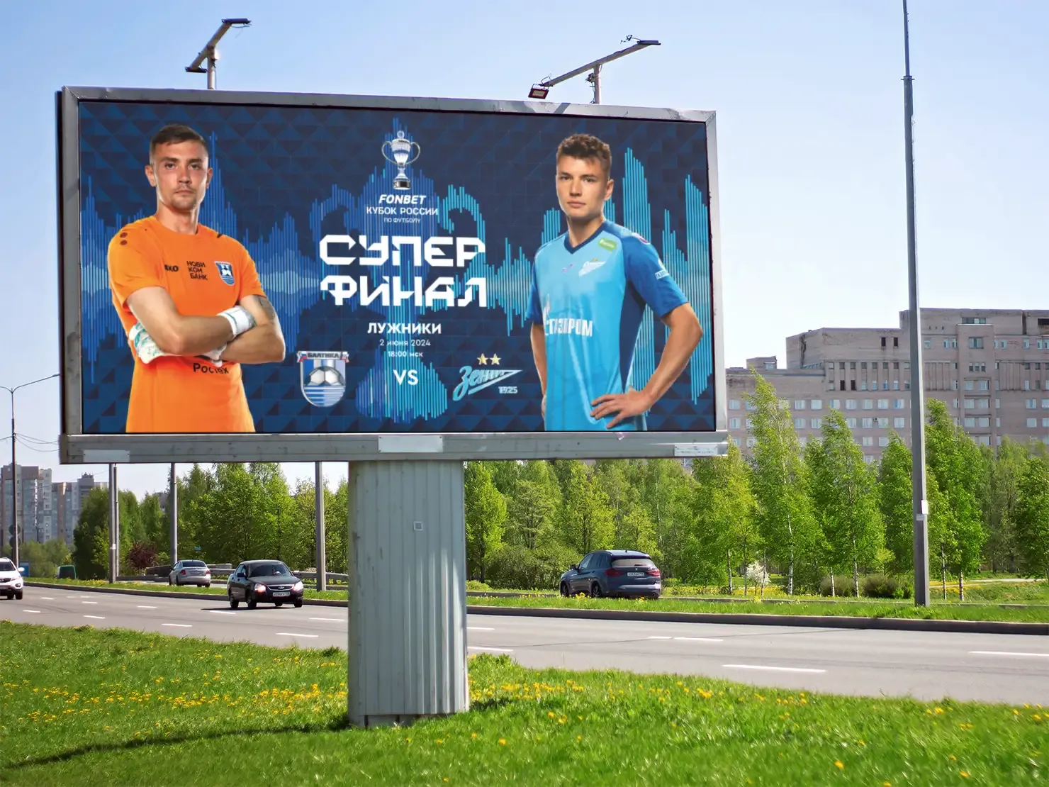 Наша команда разработала айдентику для этого события, а также матчевую графику для огромных экранов на арене и оформление трансляции для «Матч ТВ». Мы работали на основе созданного нами же общего стиля FONBET Кубка России, но сделали дополнительные образы, что наделило наши материалы новым смыслом. Креатив строится на образе звуковой волны и шкалы эквалайзера. Этот образ напоминает нам о громком празднике футбола. Это победные гимны, трубы, барабаны, и неумолкающий шум матча. В рекламных материалах и оформлении арены мы рисуем звуковой волной символы Москвы: «Москва-Сити» и сталинские высотки.