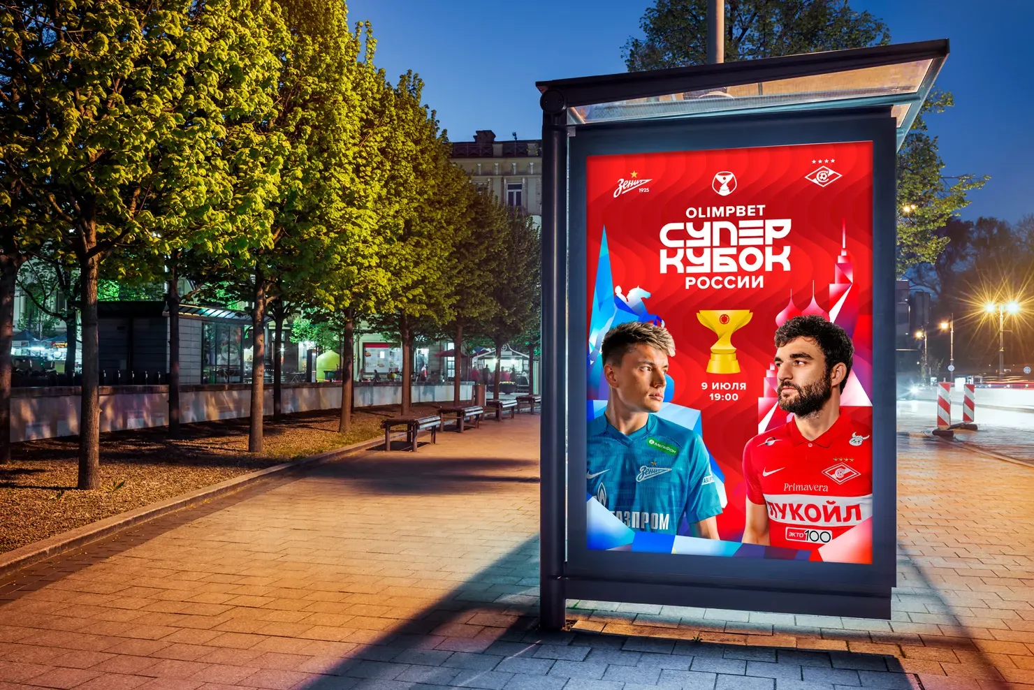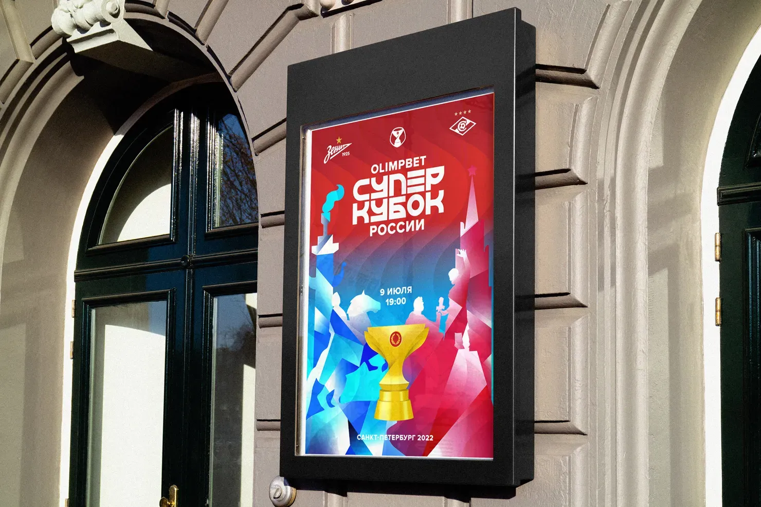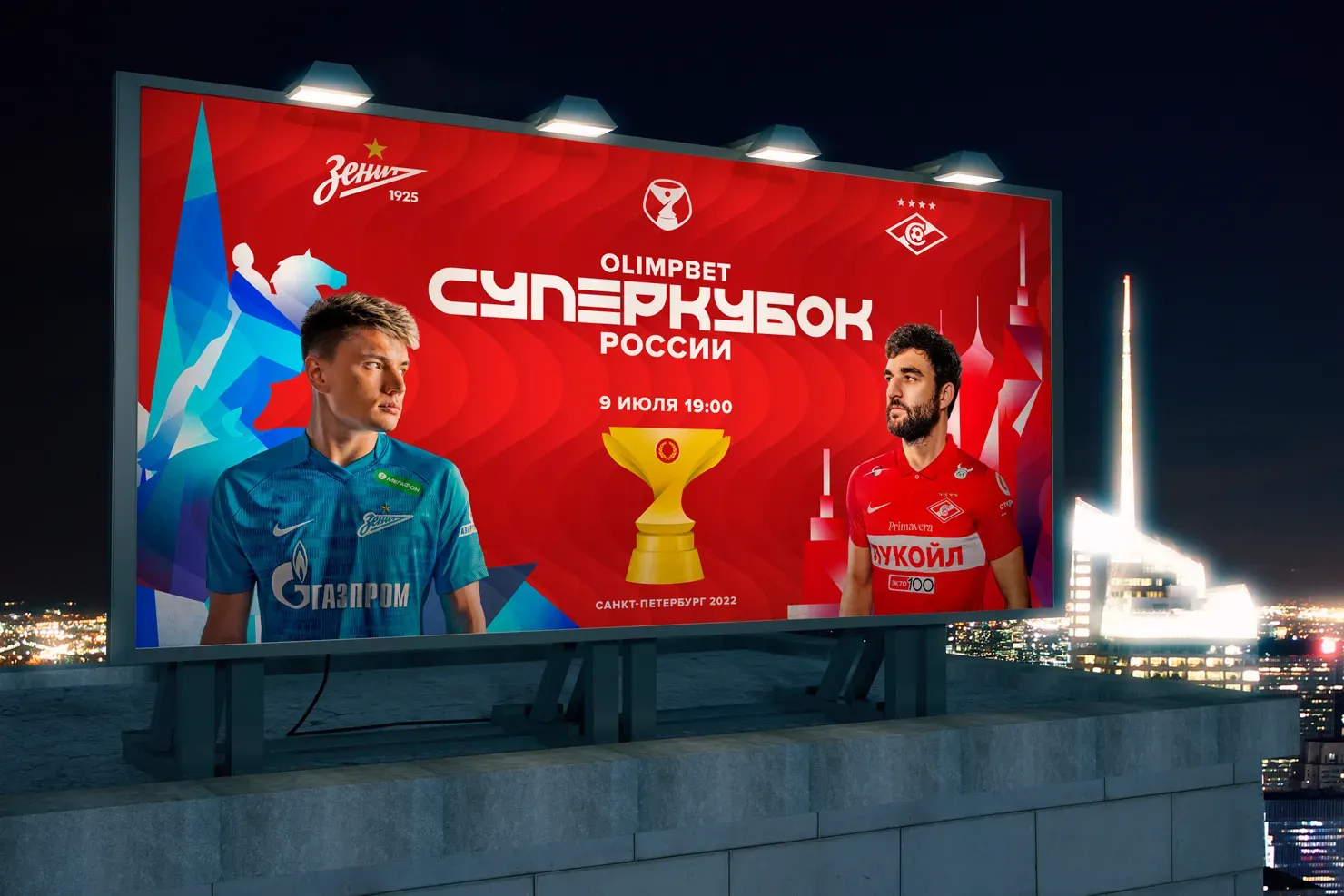 В матче встретились «Зенит» и «Спартак». Поэтому центральной темой фирменного стиля стало противостояние Петербурга и Москвы. В градиенте используются фирменные цвета клубов — голубой и красный. Набор иллюстраций включает в себя символы городов, продолжая тему соперничества.