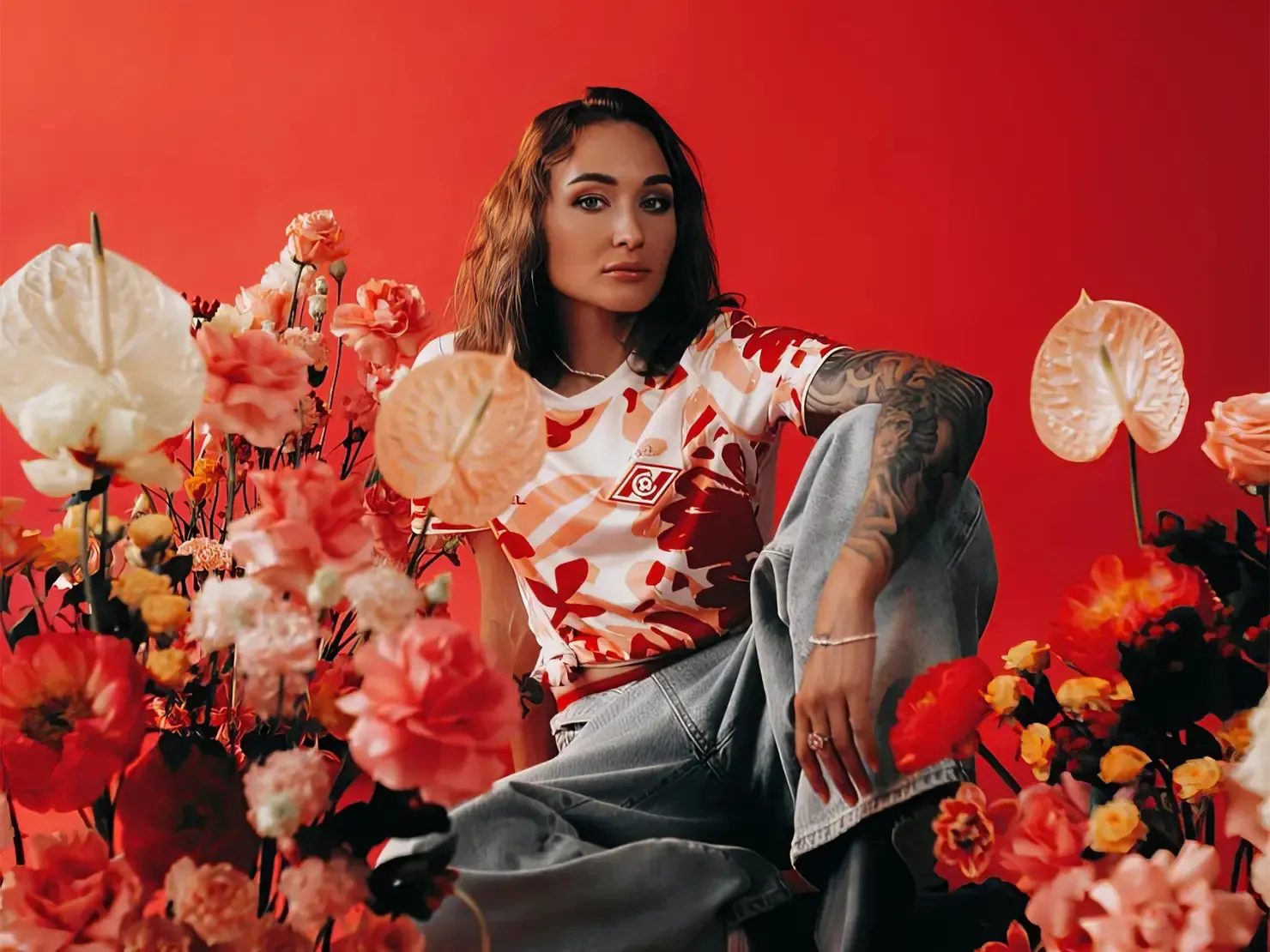 Футболка выполнена в бежево-красных тонах, а цветочный узор символизирует женственность и яркую игру команды на поле. Футболка задумывалась не только как часть спортивной формы, но и как нарядный кежуал.